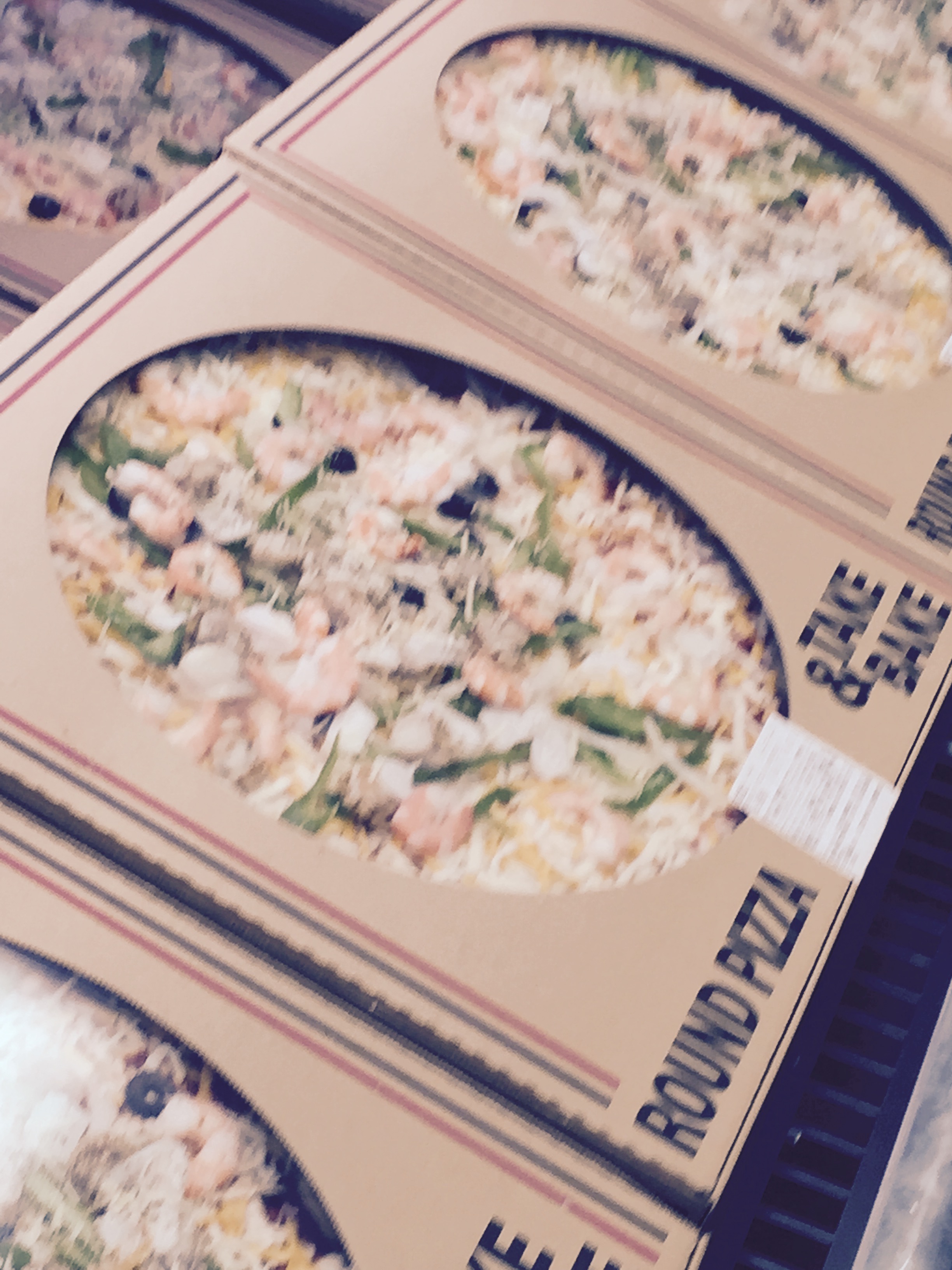 The Costco pizzas mystified me. They looked far too large for my tiny Japanese oven, so I measured the pizza (15 inches across) to check at home later. Sure enough, said pizza will not fit in my oven. Yet the pizza display was just as big as at home, and the crowds just as enthusiastic. The pizza section held three varieties: a few plain cheese pizzas, a few with pepperoni, and the vast majority with mixed seafood, as shown at left (sorry about the blurry photo).
