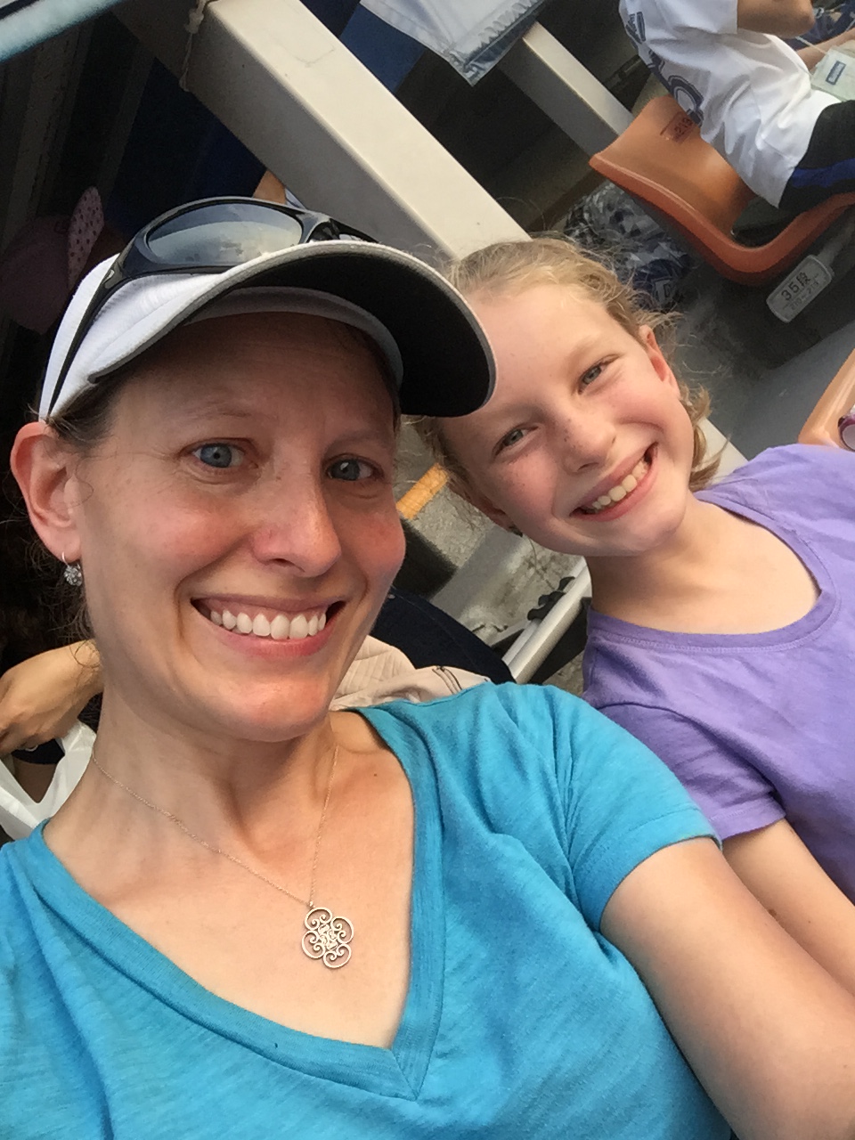 The weather was insanely hot and sunny with no shade. Thankfully we were in the last row of the very highest section, and we found a little shade in the overhang right behind our row, which you can see in the photo of Tessa and me. Most of the kids stuffed back there. And me, because I have no shame.