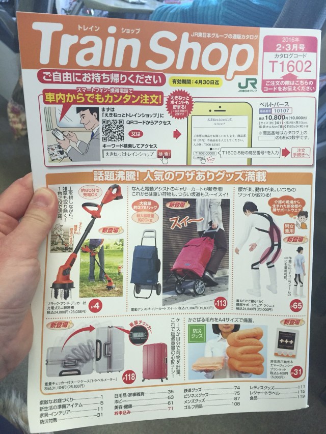 Tessa and I are on our way to Tokyo station to catch the Shinkansen to Niigata prefecture for our ski weekend. Our current ride is the Limited Express, with seats more like a commuter train–and Train Shop magazine!