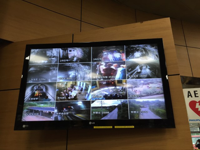 Over the years the South discovered several tunnels from the North to South crossing under the DMZ. Our first stop on the tour was to one such tunnel, called the Third Infiltration tunnel. It measured not-quite 2 meters in height, which meant hunching over and occasionally whacking a hard hat-protected head on the pipes overhead. We walked along the rough walls blasted from rock and stopped just short of the Line of Control. Three walls of concrete seal the tunnel, and small windows in the first wall allowed us to peek through to the next gap. Photos inside the tunnel itself were forbidden, but this shot of the various cameras inside the tunnel shows our journey.