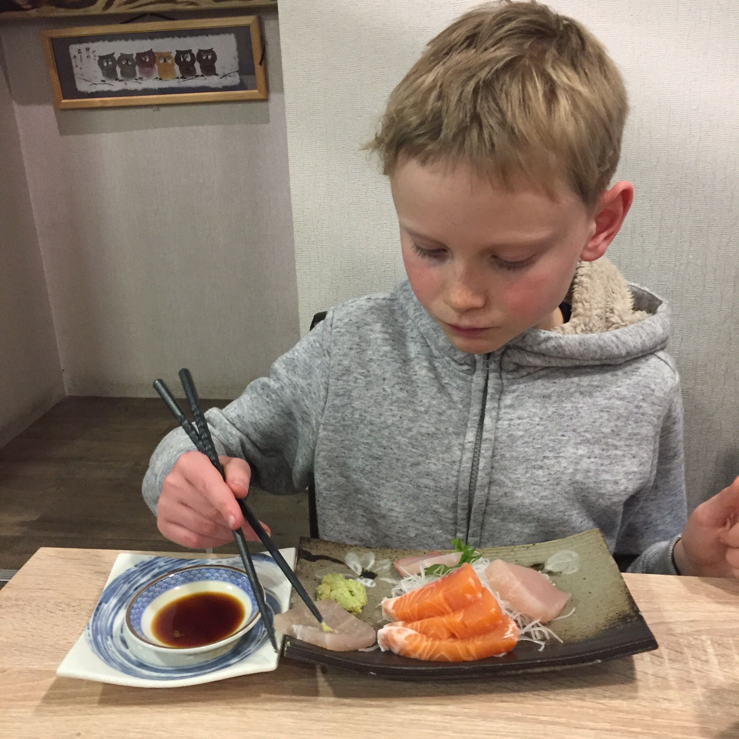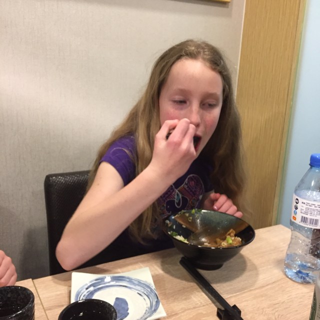 Tessa found the chicken on the spicy side, so Mark let her pick the next stop. We ended up in a Japanese place where Tessa had some gyodon (beef over rice) and Cy had sashimi.