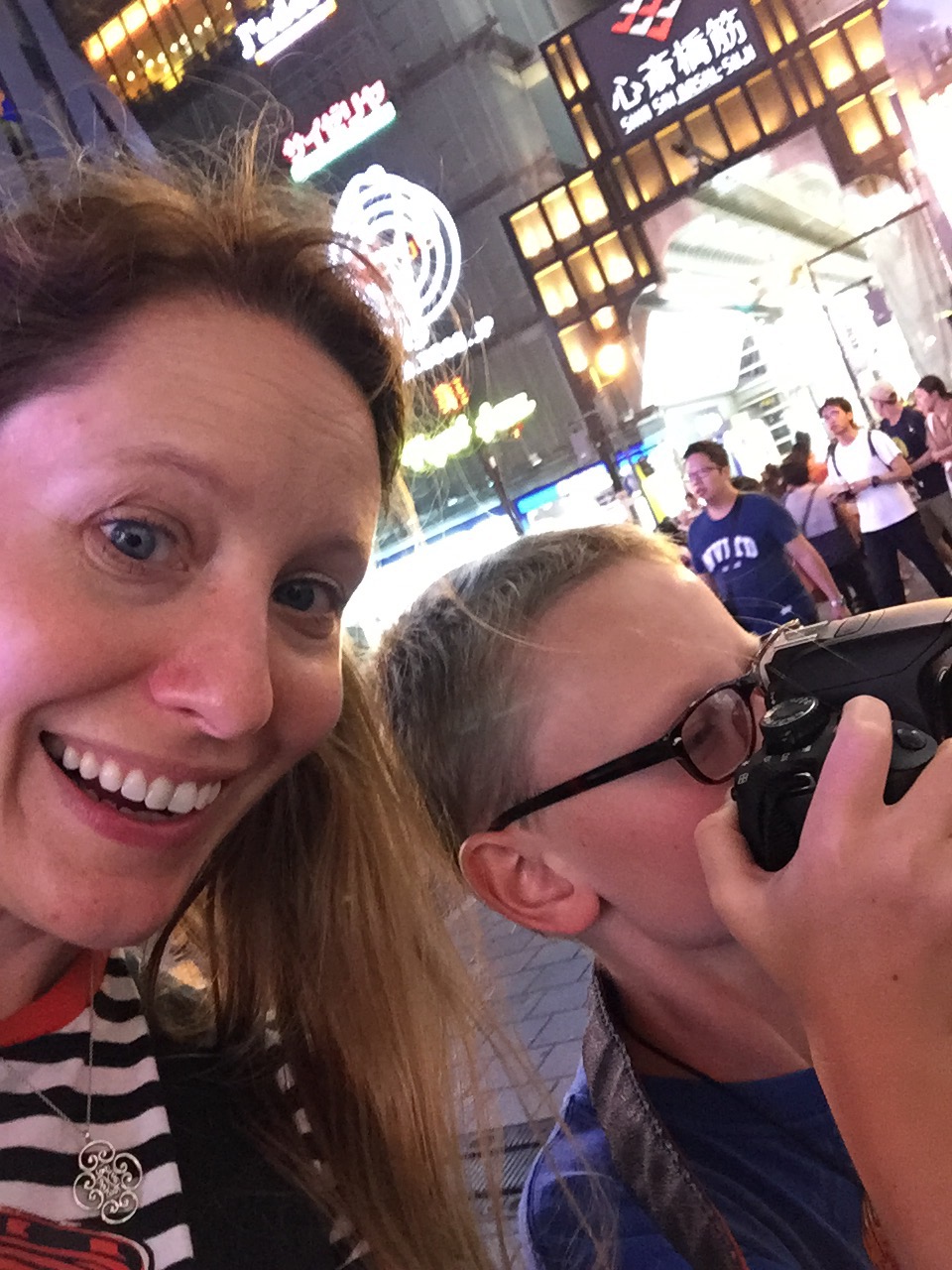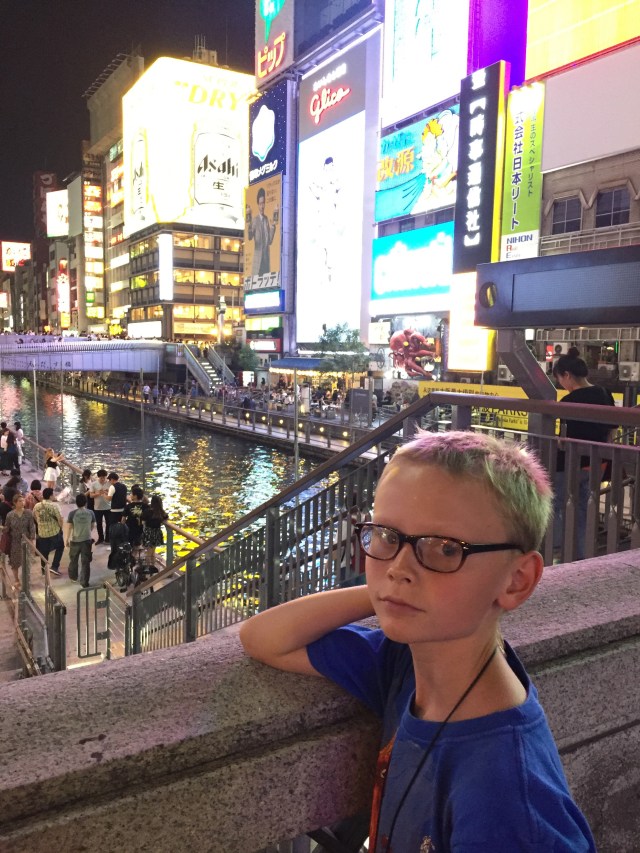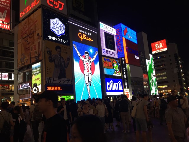 After arriving in Osaka and leaving our bags at our hotel room, Cy and I headed out to see the lights of Dotombori, the famous stretch of riverside neon–and tourists.