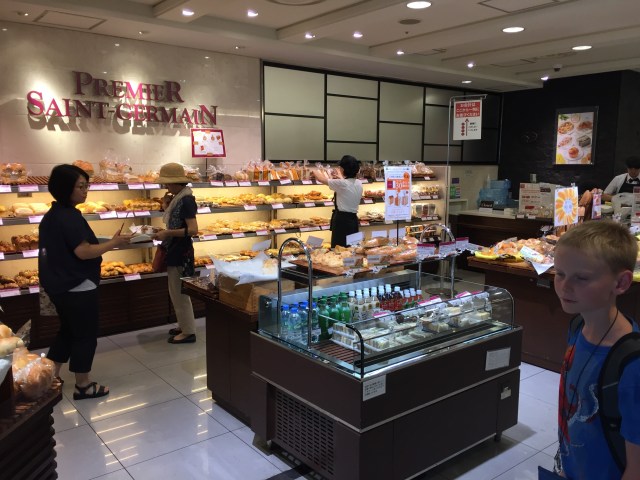 Cy and I took the bus and subway from our house to Shin Yokohama station with plenty of time for snack shopping. We headed up to the two-story Takashimaya Foodmaison and weighed our options.