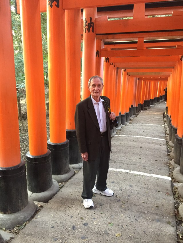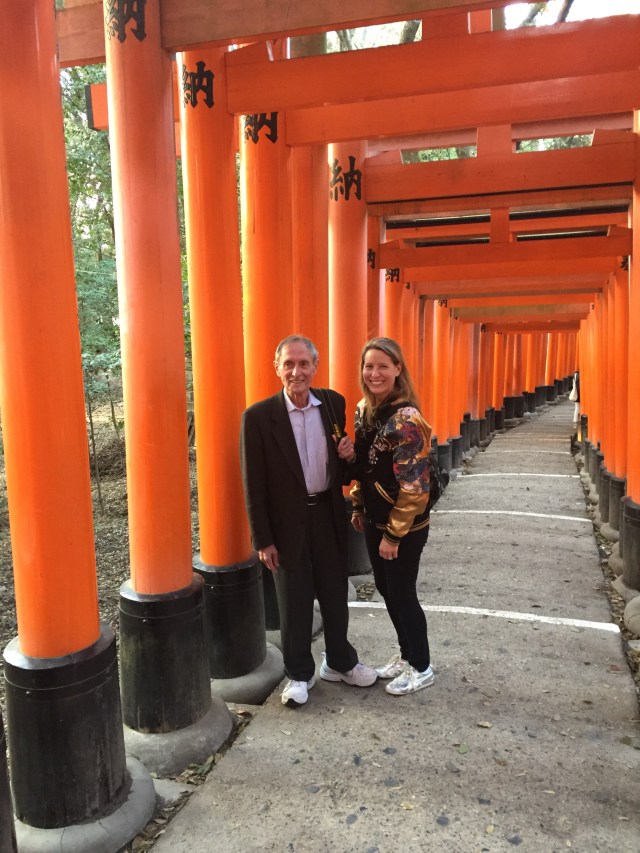 After relaxing in our hotel for a bit, we headed for Kyoto’s busiest tourist site, Fushimi Inari shrine. It’s not only the most visited tourist attraction in Kyoto but also in all of Japan. The late afternoon visit proved to be a wise choice; we experienced fairly uncongested pathways as well as the Golden Hour for photography, right before sunset.
