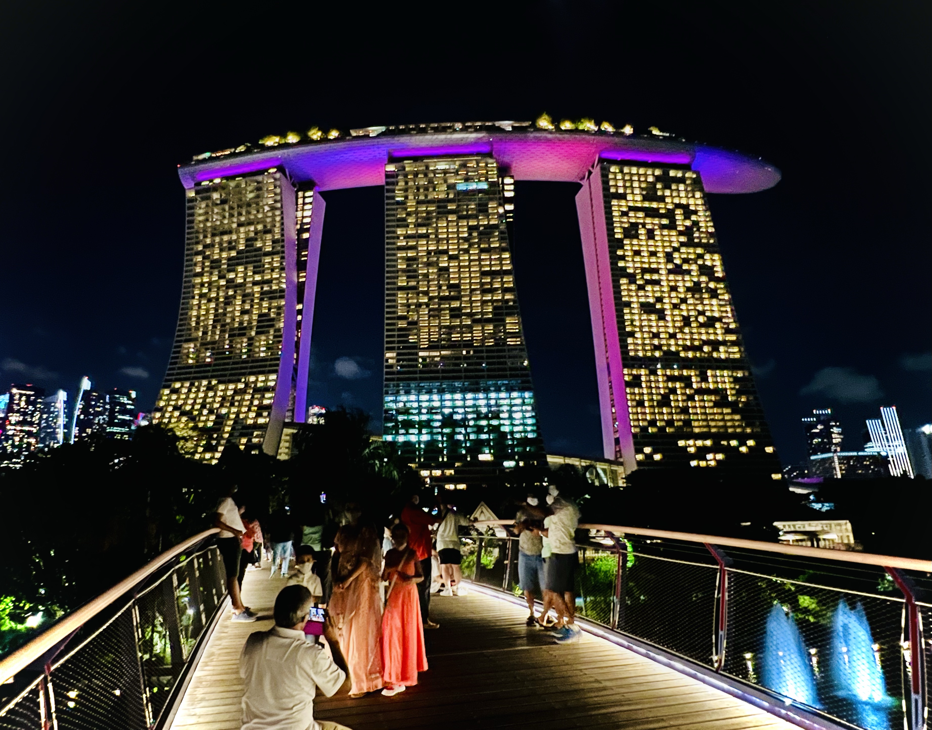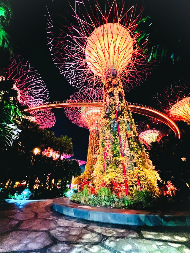 The Gardens consist of numerous exhibits like the Cloud Forest, Floral Fantasy, and the famous Supertrees. Each of those exhibits requires separate admissions tickets, and we knew in advance that we would arrive too late for the last admission. Our plan was to simply wander the grounds, get a general idea of what the Gardens offer, and enjoy the festive decorations and illuminations without the punishing sun of a daytime visit.