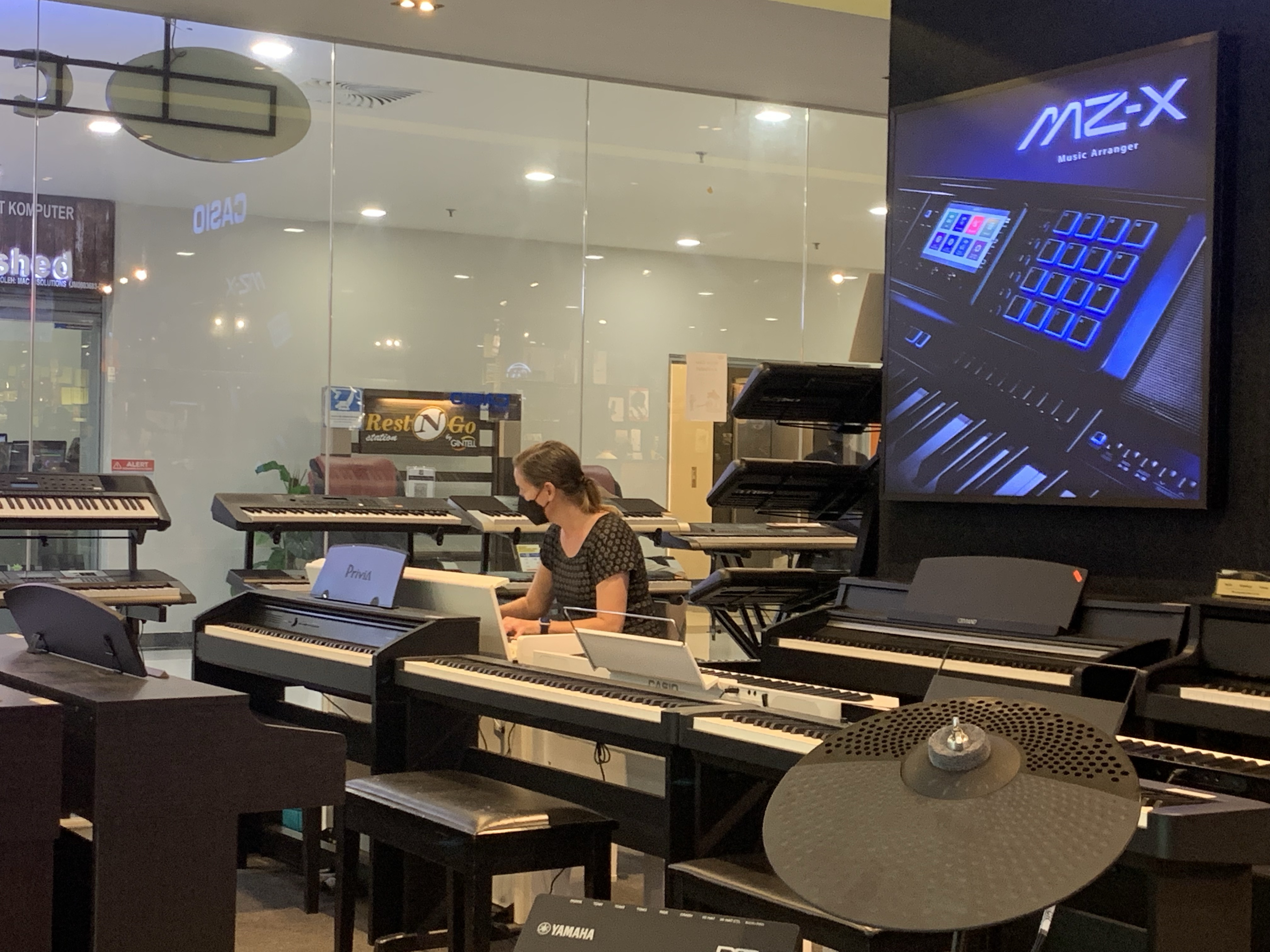 After the mosque we cabbed it back to (surprise!) another mall. Before our trip I found a large-ish looking music store there, and I decided to check it out to see if the boy might like to visit. He has gotten quite good at both bass and guitar, and visiting guitar stores while traveling has become a steady request. C&M Music looked pretty promising online, but frankly I found it only OK in person.