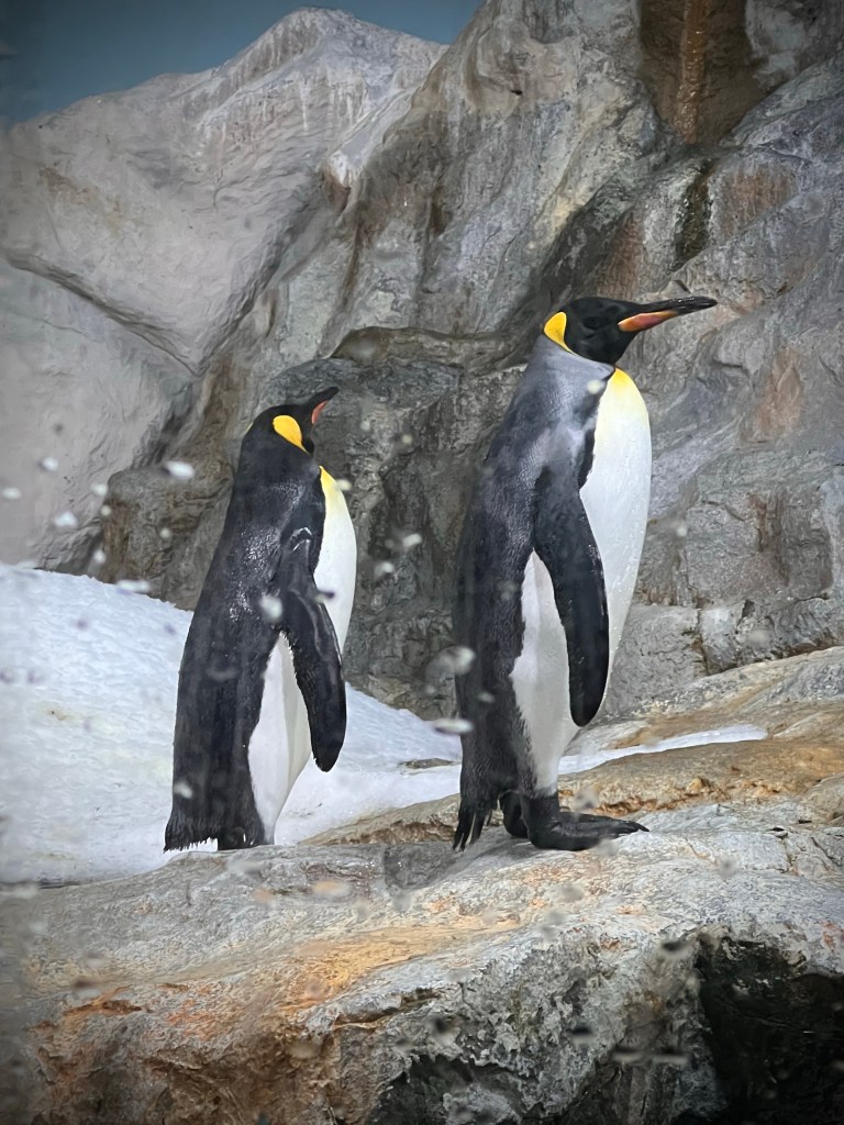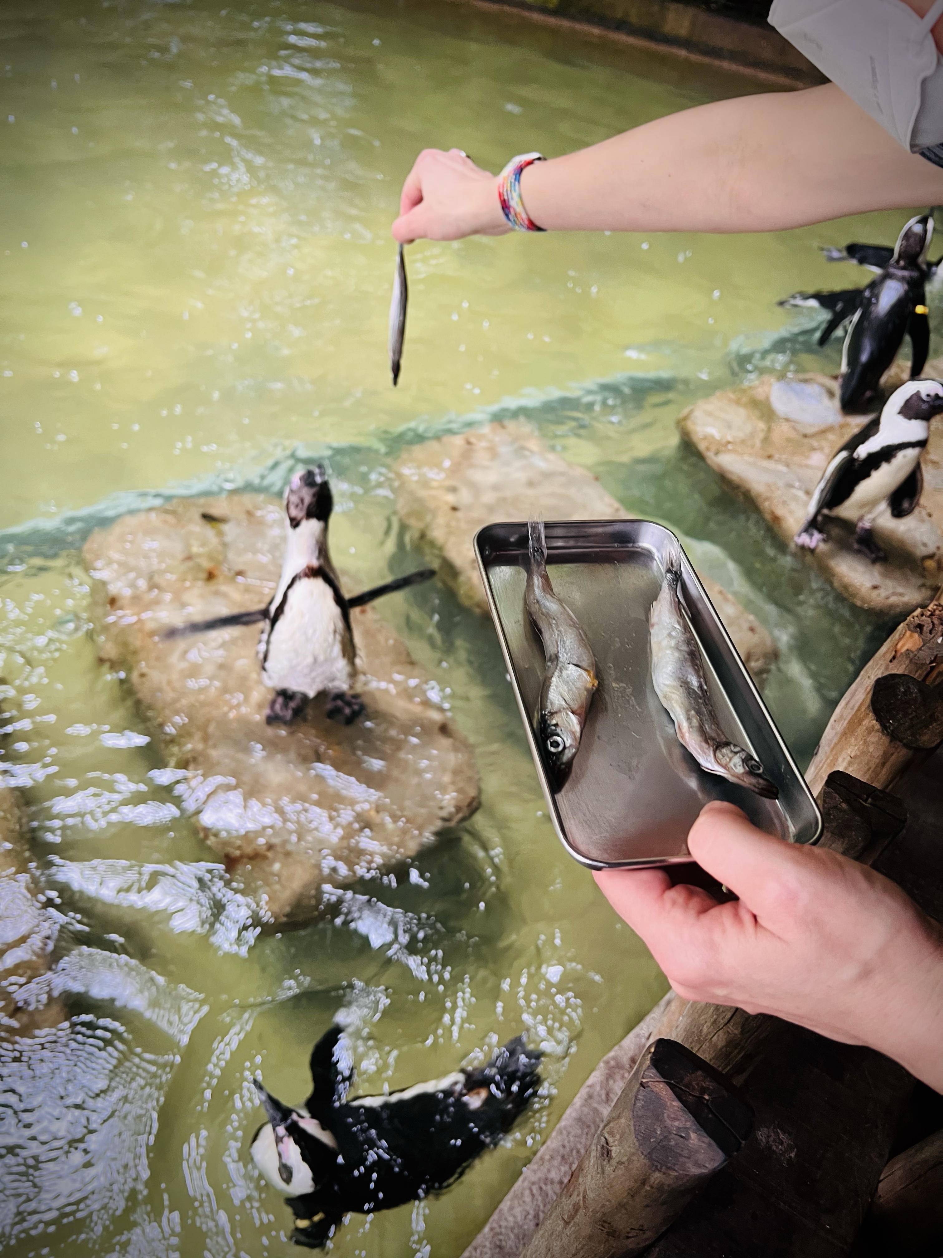 Feeding the penguins was…..fine. Prior to our visit I purchased three portions, the maximum remaining for our time slot. Each portion consisted of a tray with three fish on it. We learned that we could not wear gloves and simply held the fish by the tail to feed the penguins–at which point Tessa volunteered to act as the family photographer. The three fish disappeared rather quickly and anticlimactically.