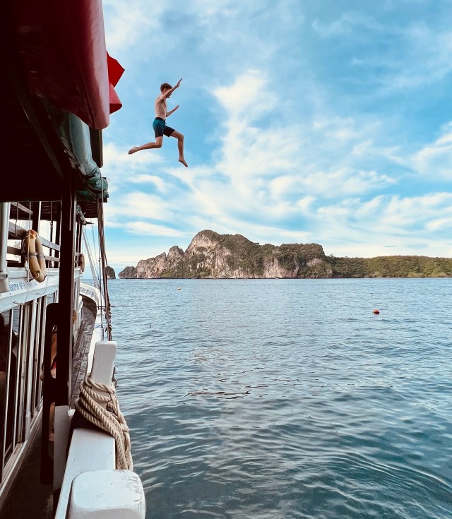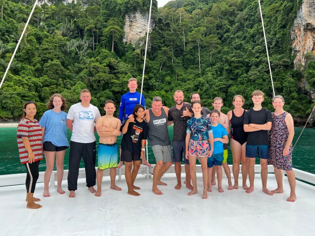 Like in many international schools, Singapore American School offers students a short school holiday midway through the first semester. So in mid-October we decided to join our friends Mike and Tara and their three kids on a boat trip floating around Thailand. We flew to Phuket, where we met up with the crew of Merdeka for our five-day cruise around the Phi Phi Islands.