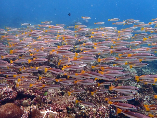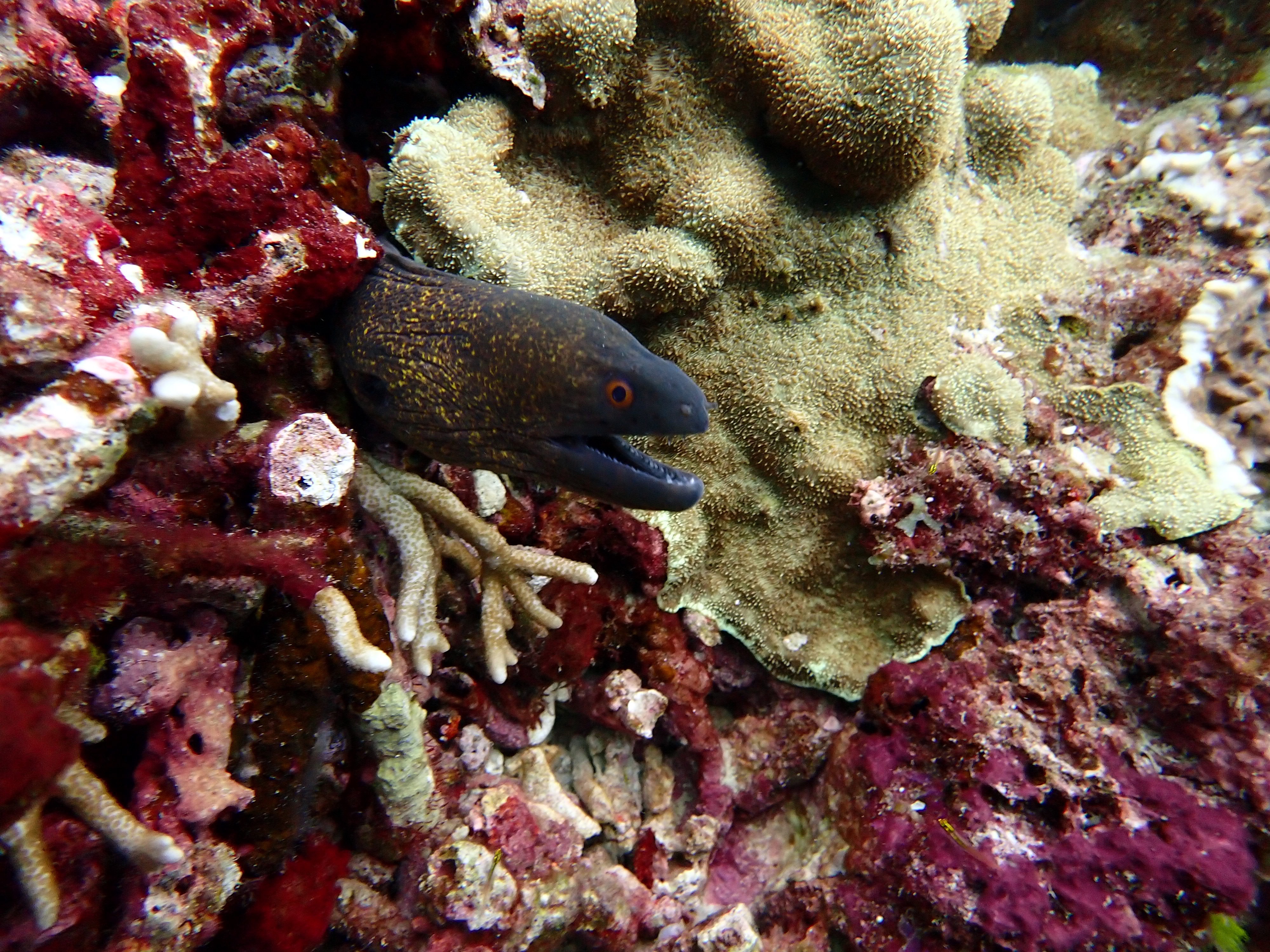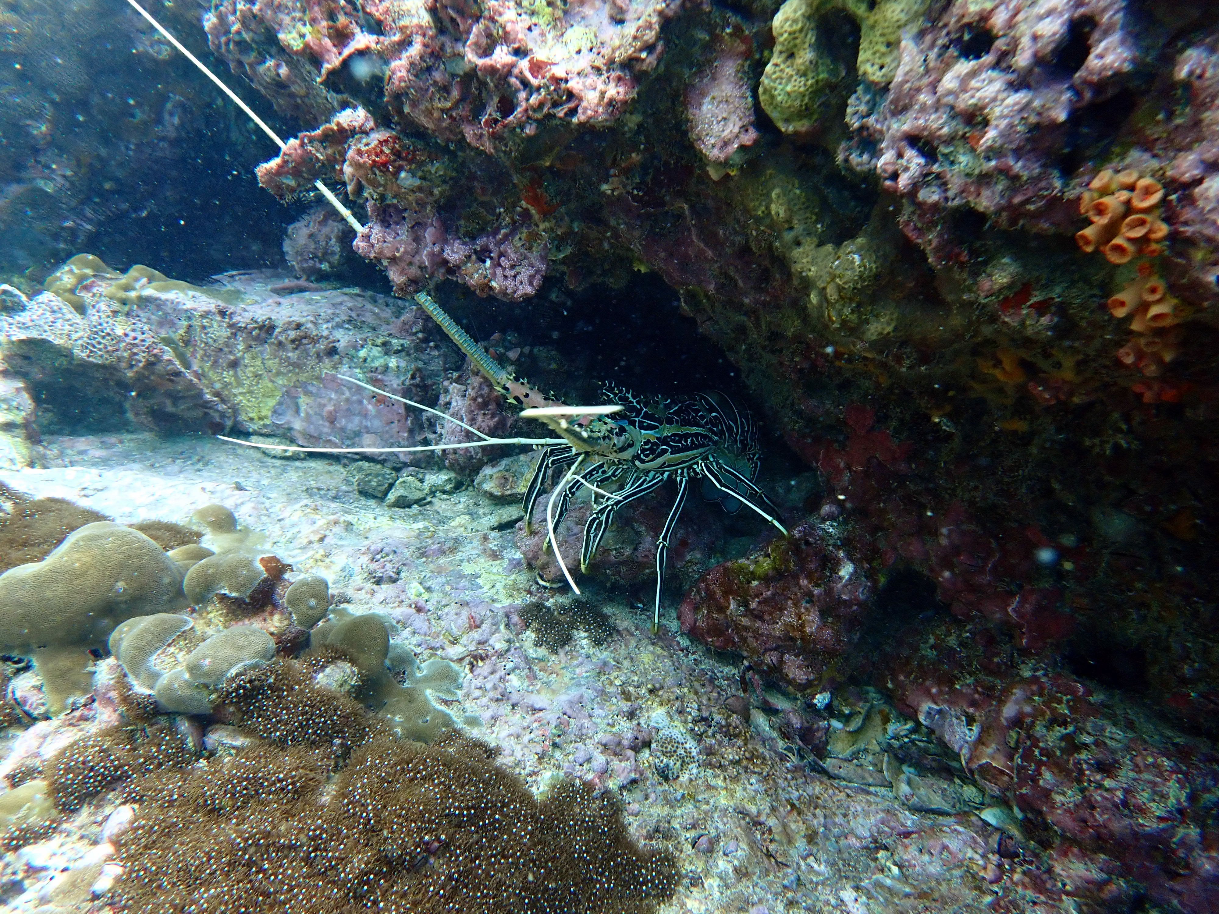 Despite heavy seas and incessant rain the first two days, we started diving right away. The three certified divers–me, Mark, and Mike–set out with one divemaster, while the newbies tried out some trial dives with the other dive instructors. The three boys decided to complete their diving certifications during the trip. When I certified in 2006 I did my very first training in a swimming pool; these boys walked out to the beach and did their training dives in shallow water with palm trees and cliffs in the background. Not so bad!